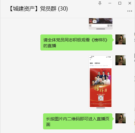 《榜樣8》專題節(jié)目直播當天及時在公司黨員群內(nèi)轉(zhuǎn)發(fā)觀看時間和觀看方式