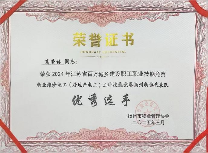 維修電工(房地產(chǎn)電工)工種技能競賽“優(yōu)秀選手 ”,高榮林同志,憑借出色的工作技能,在省級競賽“江蘇省百萬城鄉(xiāng)建設(shè)職工職業(yè)技能競賽物業(yè)維修電工(房地產(chǎn)電工)工種技能競賽”中榮獲“優(yōu)秀選手 ”稱號。這一榮譽稱號,不僅是對該名員工個人能力的認(rèn)可,更是對城建物業(yè)在員工培養(yǎng)與團(tuán)隊建設(shè)方面的肯定。