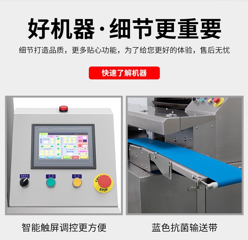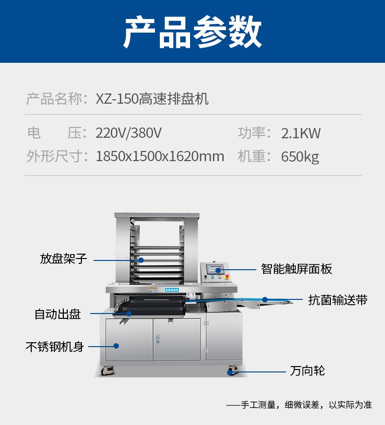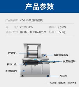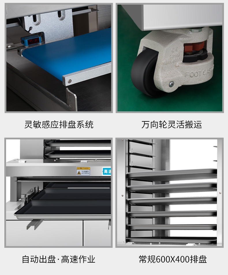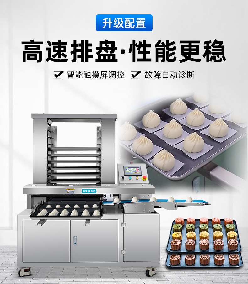 多功能商用高速排盤機,自動化程度高,可根據產品大小自由調節列數、排數,自動將產品自動地排放在烘盤中,操作簡單,運行平穩。智能觸屏面板。控制系統由三菱PLC和進口觸摸屏組成,操作簡單方便。具有故障自動診斷,一目了然。