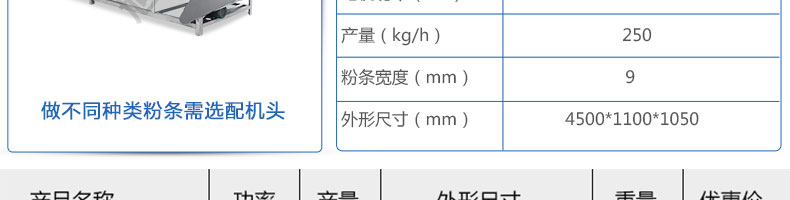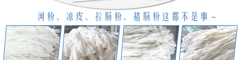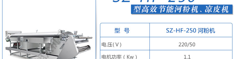 名稱SZ-HF-250涼皮機 電源220/380V 功率1.1/81kw 產量100/150/200/250kg/h 尺寸主機尺寸5500*1000*1050mm 外形尺寸5600*1200*1500mm 重量500kg 規格粉條寬度mm:4/6/8/10 其他
