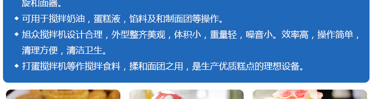 SZM10、15、20、25、30攪拌機(jī)系列,可用于攪拌奶油、蛋糕液、餡料及和制面團(tuán)等操作。打蛋攪拌機(jī)等作攪拌食料、揉和面團(tuán)之用,是生產(chǎn)優(yōu)質(zhì)糕點(diǎn)的理想設(shè)備,適用于酒店、飯店、學(xué)校部門(mén)、面包屋以及食品廠家。