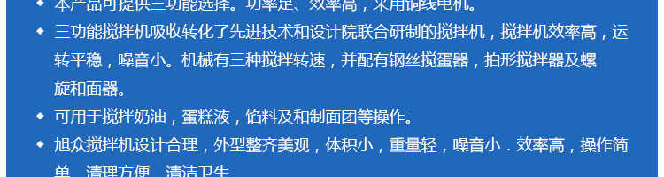 SZM-20型四功能攪拌機,可用于攪拌奶油、蛋糕液、餡料及和制面團等操作。打蛋攪拌機等作攪拌食料、揉和面團之用,是生產優質糕點的理想設備,適用于酒店、飯店、學校部門、面包屋以及食品廠家。
