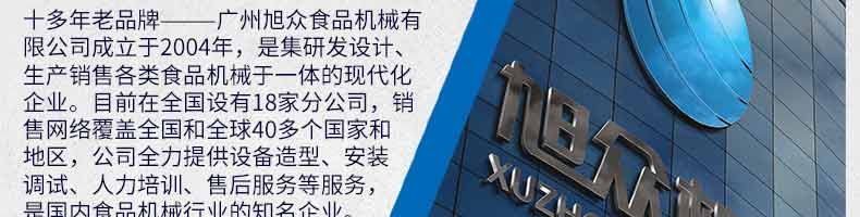 廣州旭眾食品機(jī)械有限公司是一家集科研開發(fā),生產(chǎn)設(shè)計,營銷服務(wù)為一體的現(xiàn)代化生產(chǎn)企業(yè)。現(xiàn)代化生產(chǎn)車間,精湛制造技術(shù),所產(chǎn)機(jī)械歷經(jīng)市場重重考驗,不斷贏得海內(nèi)外客戶的贊譽。