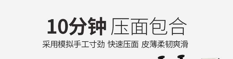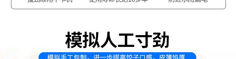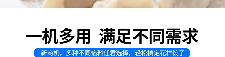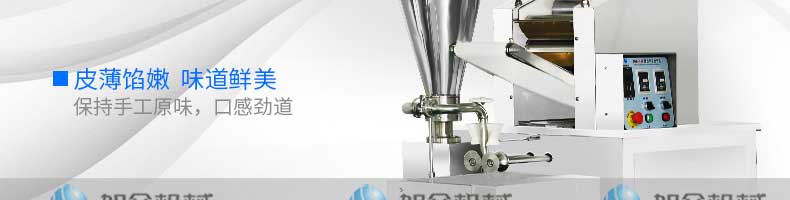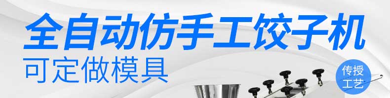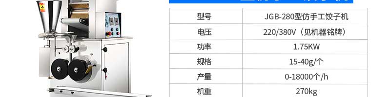 名稱JGB-360仿手工餃子機 電源220/380v 功率1.75kw 產量0-24000個/h 尺寸3680*820*1450mm 重量450kg 規格12-38g/個 其他