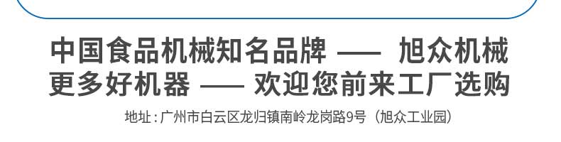 廣州旭眾食品機械有限公司是一家集科研開發,生產設計,營銷服務為一體的現代化生產企業。現代化生產車間,精湛制造技術,所產機械歷經市場重重考驗,不斷贏得海內外客戶的贊譽。