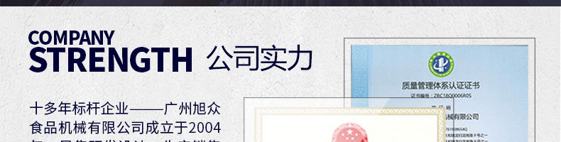 廣州旭眾食品機械有限公司是一家集科研開發,生產設計,營銷服務為一體的現代化生產企業。現代化生產車間,精湛制造技術,所產機械歷經市場重重考驗,不斷贏得海內外客戶的贊譽。