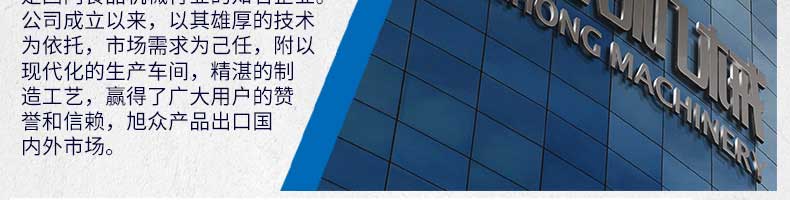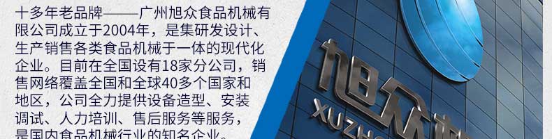 廣州旭眾食品機械有限公司是一家集科研開發(fā),生產設計,營銷服務為一體的現(xiàn)代化生產企業(yè)。現(xiàn)代化生產車間,精湛制造技術,所產機械歷經市場重重考驗,不斷贏得海內外客戶的贊譽。