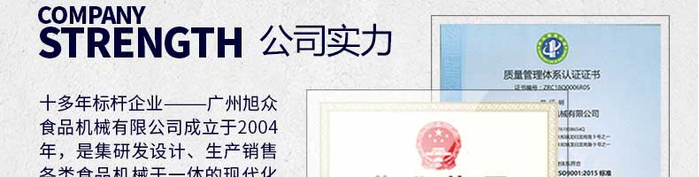 廣州旭眾食品機械有限公司是一家集科研開發(fā),生產(chǎn)設計,營銷服務為一體的現(xiàn)代化生產(chǎn)企業(yè)。現(xiàn)代化生產(chǎn)車間,精湛制造技術,所產(chǎn)機械歷經(jīng)市場重重考驗,不斷贏得海內(nèi)外客戶的贊譽。