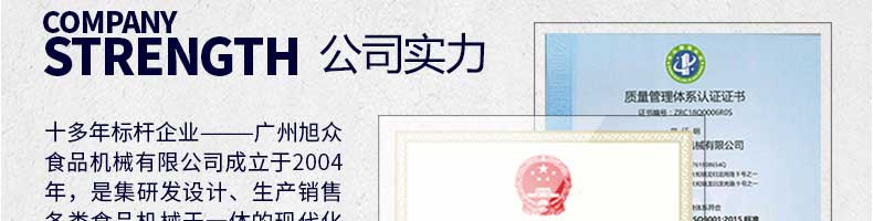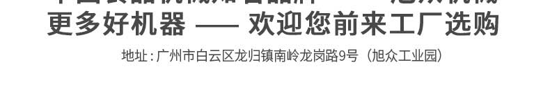 廣州旭眾食品機械有限公司是一家集科研開發,生產設計,營銷服務為一體的現代化生產企業。現代化生產車間,精湛制造技術,所產機械歷經市場重重考驗,不斷贏得海內外客戶的贊譽。