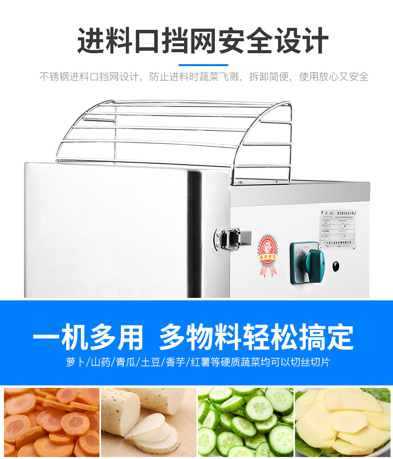 300型瓜果切絲切片機(jī),高效便捷、一次成型、每小時可切200-300KG。全不銹鋼機(jī)身經(jīng)久耐用小巧機(jī)身,方便移動使用,時尚美觀,堅固耐用。鋒利刀片、一次成型。電鍍防銹刀盤搭配不銹鋼刀片,輕輕松松應(yīng)對各種硬質(zhì)瓜果。