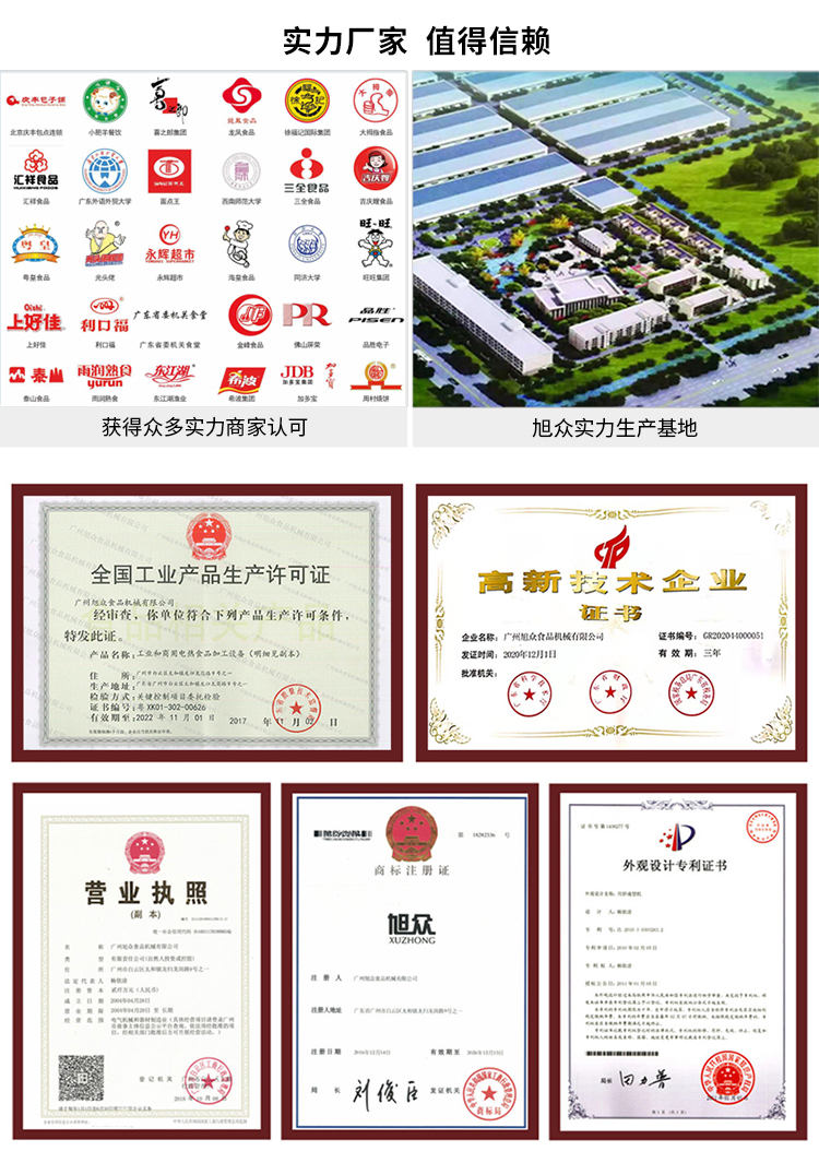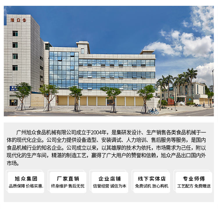 廣州旭眾食品機(jī)械有限公司是一家集科研開(kāi)發(fā),生產(chǎn)設(shè)計(jì),營(yíng)銷(xiāo)服務(wù)為一體的現(xiàn)代化生產(chǎn)企業(yè)。現(xiàn)代化生產(chǎn)車(chē)間,精湛制造技術(shù),所產(chǎn)機(jī)械歷經(jīng)市場(chǎng)重重考驗(yàn),不斷贏得海內(nèi)外客戶(hù)的贊譽(yù)。